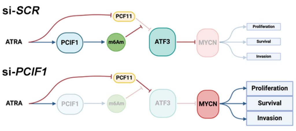 We aim to utilize the technolgies we developed to map WHERE RNA modifications are, combined with the discoveries we made for WHAT RNA modifications do, to answer WHY RNA modifications are important and what their impact in diseases are. For instance, high-risk neuroblastoma is characterized by overamplification of the MYCN gene, and is treated using all-trans-retinoic-acid (ATRA). Using m6ACE’s quantitative precision, we found that ATRA induces m6Am modification of ATF3, which is in turn a repressor of MYCN expression. Given that we had determined m6Am to sequester/suppress PCF11 to promote expression of m6Am genes, we were able to uncover m6Am’s vital role in contributing to ATRA’s therapeutic efficacy in driving neuroblastoma cell differentiation and suppressing their tumour stem-like properties (An et al. 2024).